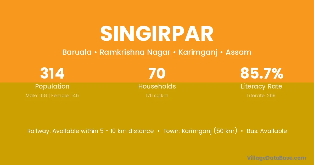 Karimganj (50 km) is the nearest town to Singirpar village for major economic activities and is located approximately 50 km away.