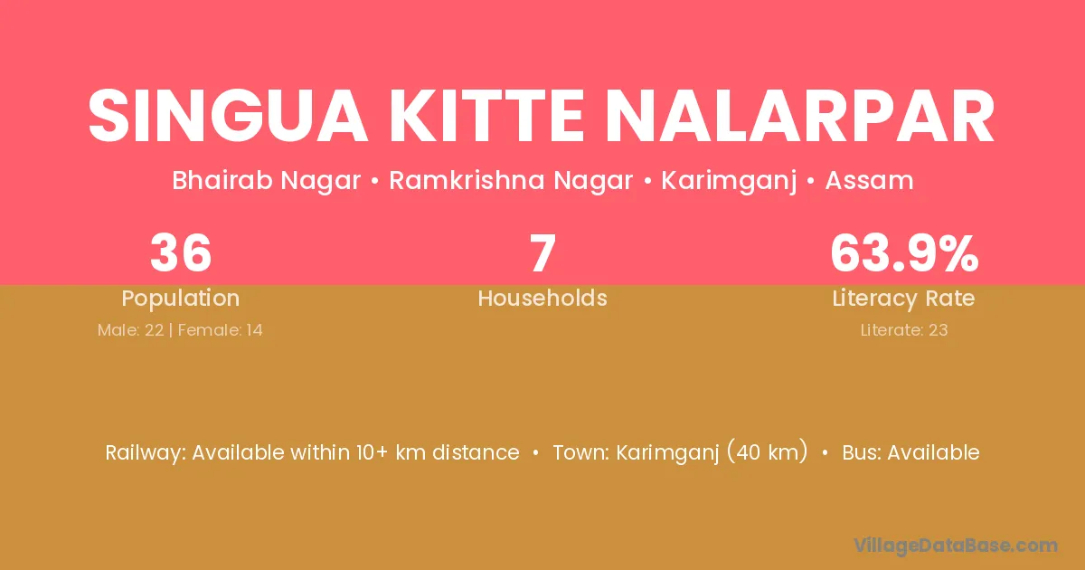 Karimganj (40 km) is the nearest town to Singua Kitte Nalarpar village for major economic activities and is located approximately 40 km away.