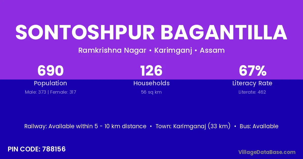 Karimganaj (33 km) is the nearest town to Sontoshpur Bagantilla village for major economic activities and is located approximately 33 km away.