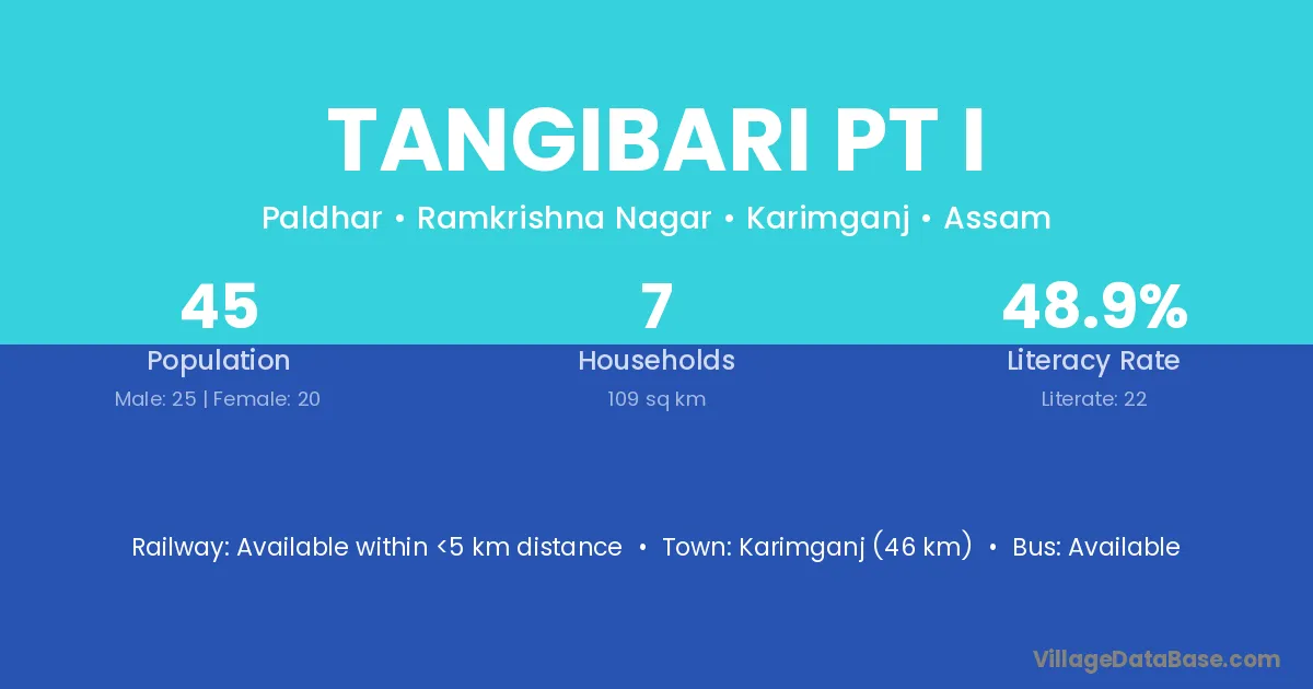 Karimganj (46 km) is the nearest town to Tangibari Pt I village for major economic activities and is located approximately 46 km away.