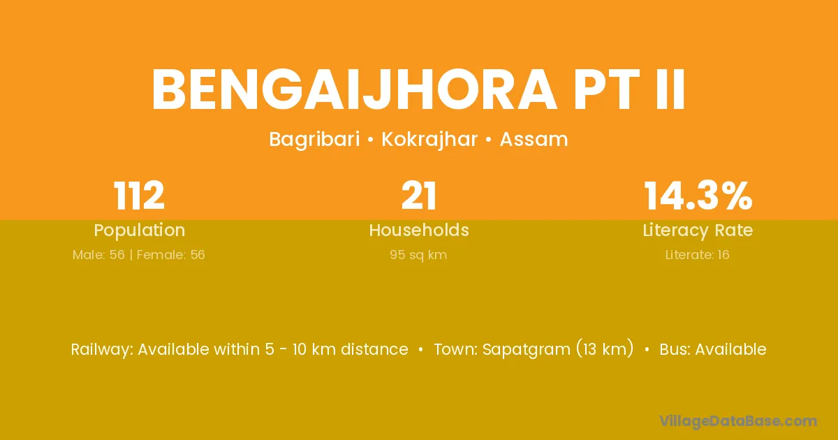 Bengaijhora Pt Ii village has a total population of 112 people, of which 56 are males and 56 are females.