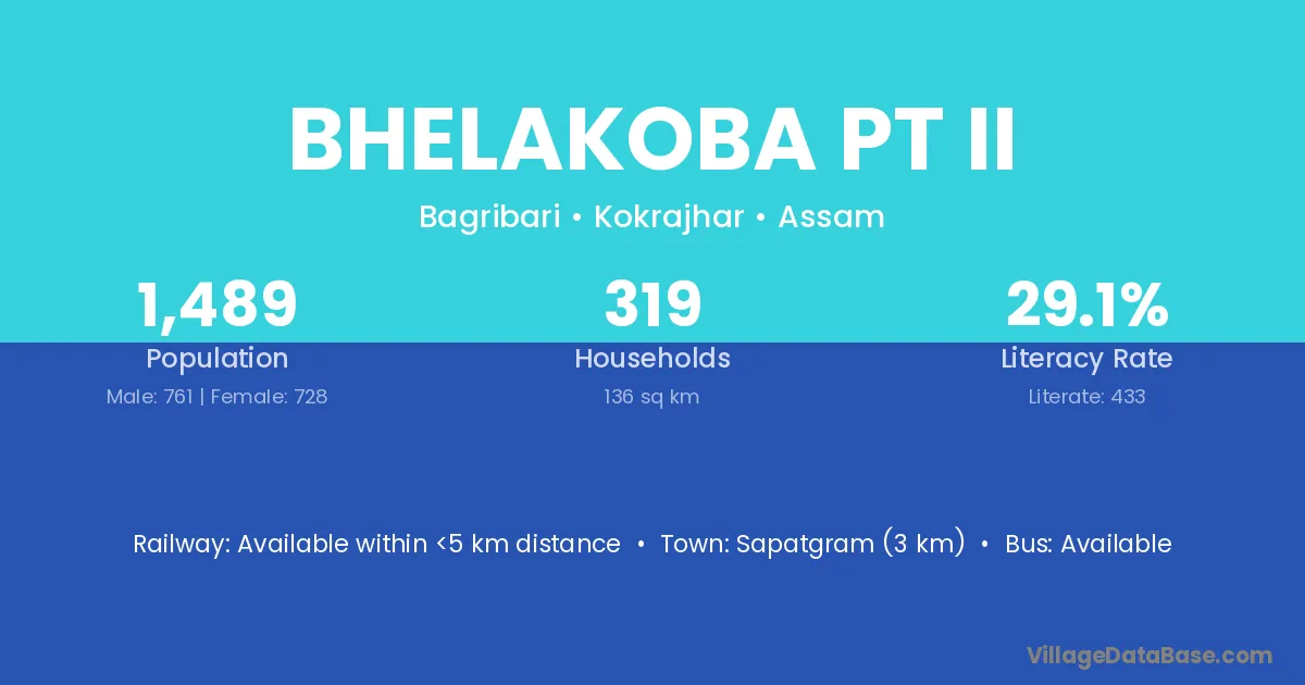Sapatgram (3 km) is the nearest town to Bhelakoba Pt Ii village for major economic activities and is located approximately 3 km away.