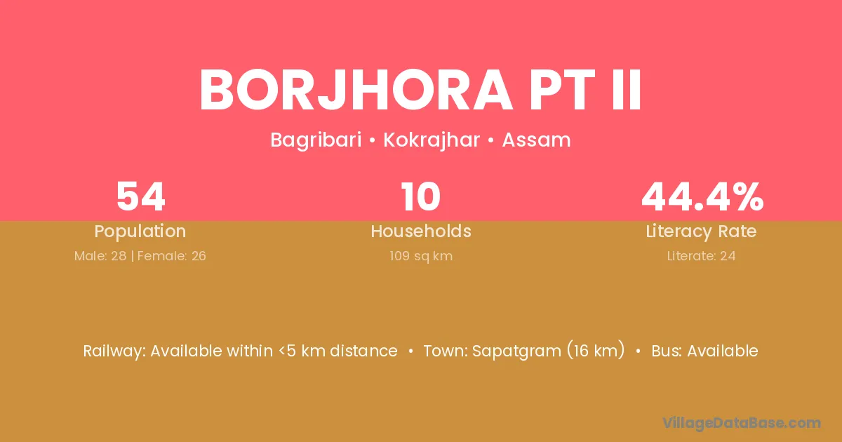 Borjhora Pt Ii village has a total population of 54 people, of which 28 are males and 26 are females.