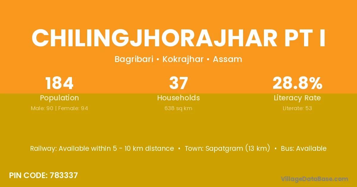 Sapatgram (13 km) is the nearest town to Chilingjhorajhar Pt I village for major economic activities and is located approximately 13 km away.
