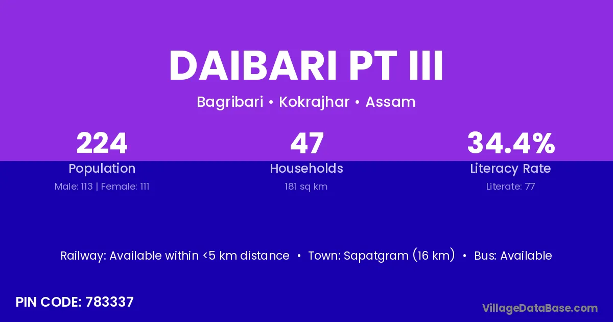 Sapatgram (16 km) is the nearest town to Daibari Pt Iii village for major economic activities and is located approximately 16 km away.