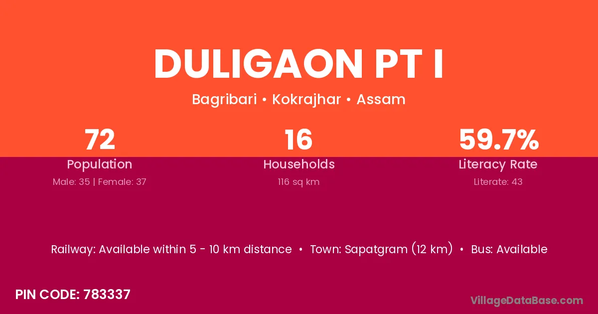 Duligaon Pt I village has a total population of 72 people, of which 35 are males and 37 are females.