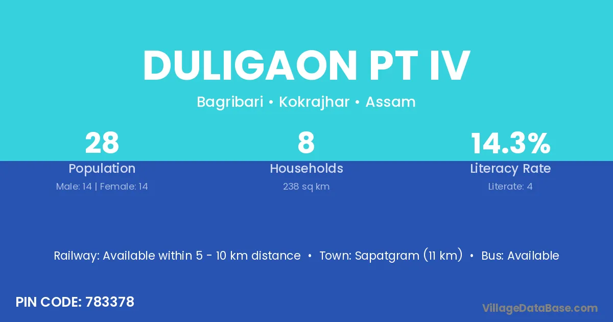 Duligaon Pt Iv village has a total population of 28 people, of which 14 are males and 14 are females.