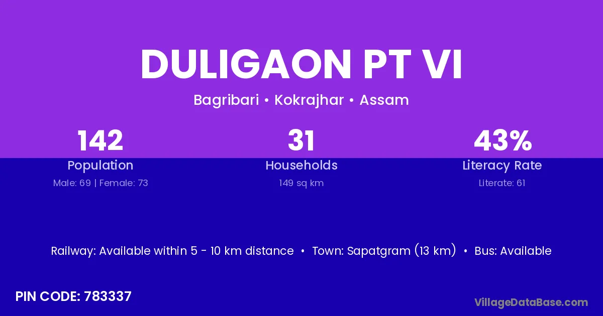 Sapatgram (13 km) is the nearest town to Duligaon Pt Vi village for major economic activities and is located approximately 13 km away.