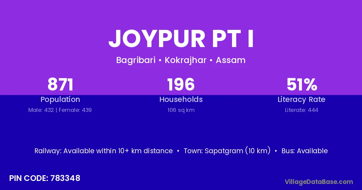 Sapatgram (10 km) is the nearest town to Joypur Pt I village for major economic activities and is located approximately 10 km away.