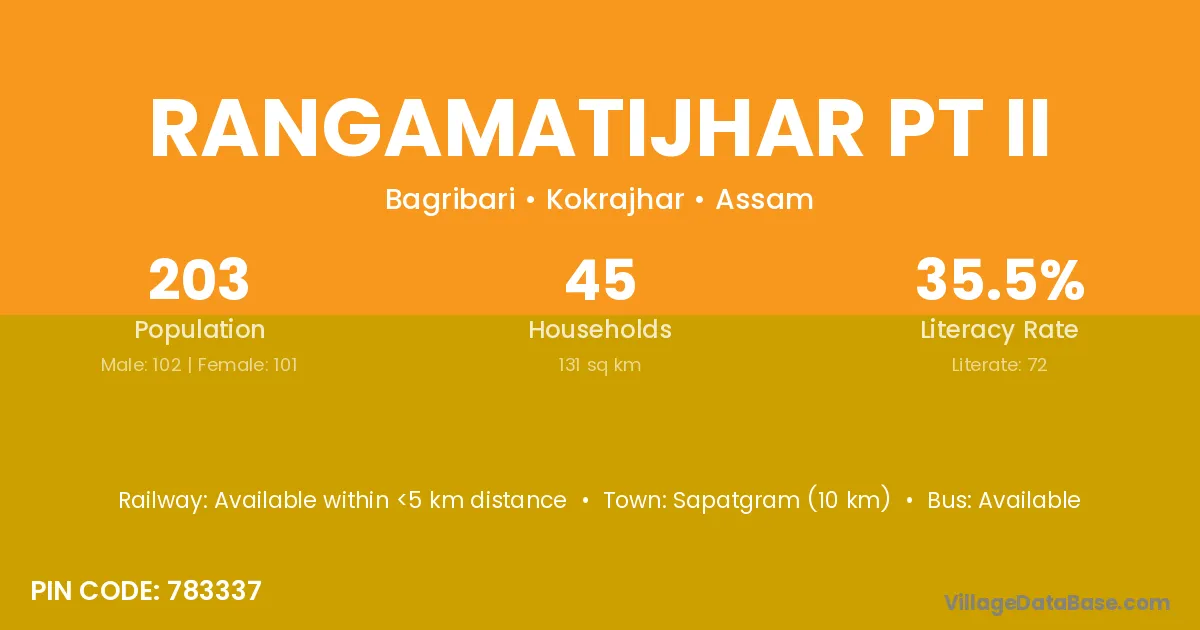 Rangamatijhar Pt Ii village has a total population of 203 people, of which 102 are males and 101 are females.