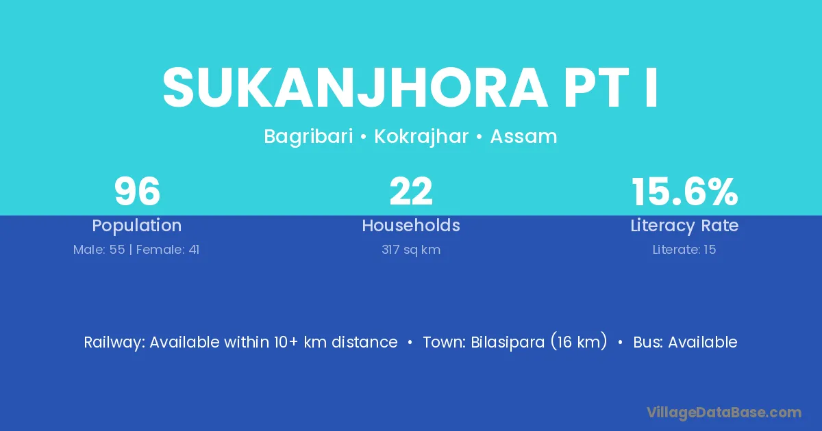 Bilasipara (16 km) is the nearest town to Sukanjhora Pt I village for major economic activities and is located approximately 16 km away.