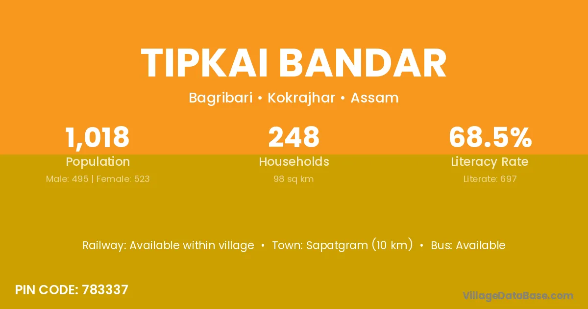 Sapatgram (10 km) is the nearest town to Tipkai Bandar village for major economic activities and is located approximately 10 km away.