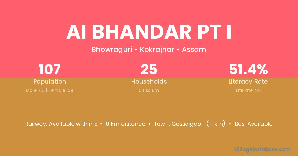 Ai Bhandar Pt I village has a total population of 107 people, of which 48 are males and 59 are females.