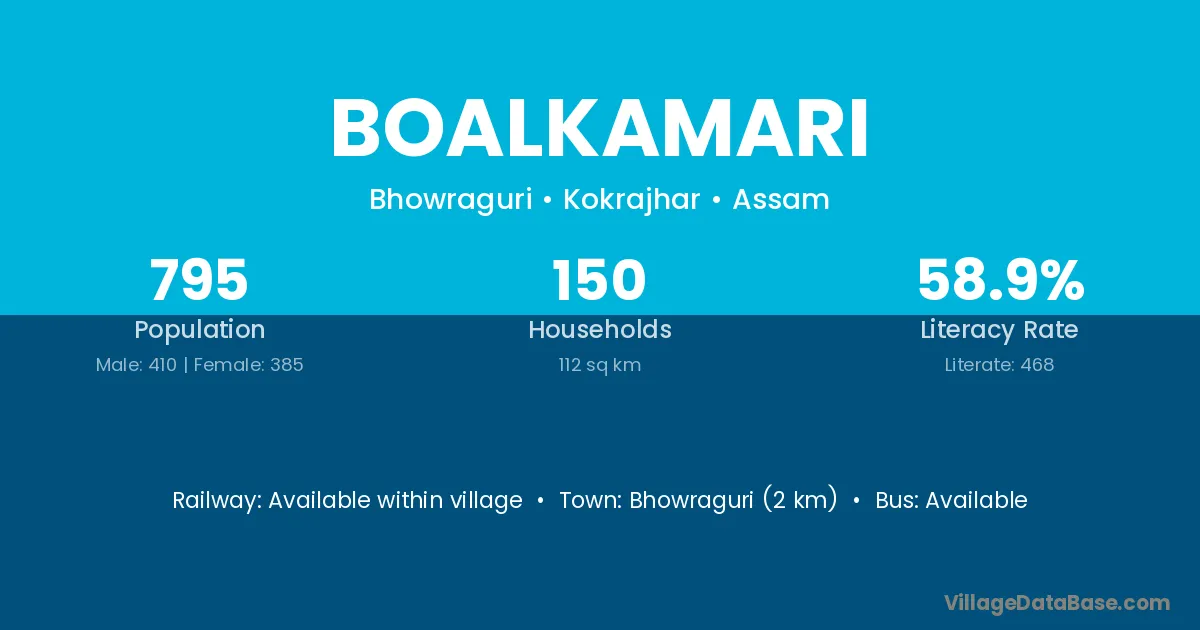 Bhowraguri (2 km) is the nearest town to Boalkamari village for major economic activities and is located approximately 2 km away.