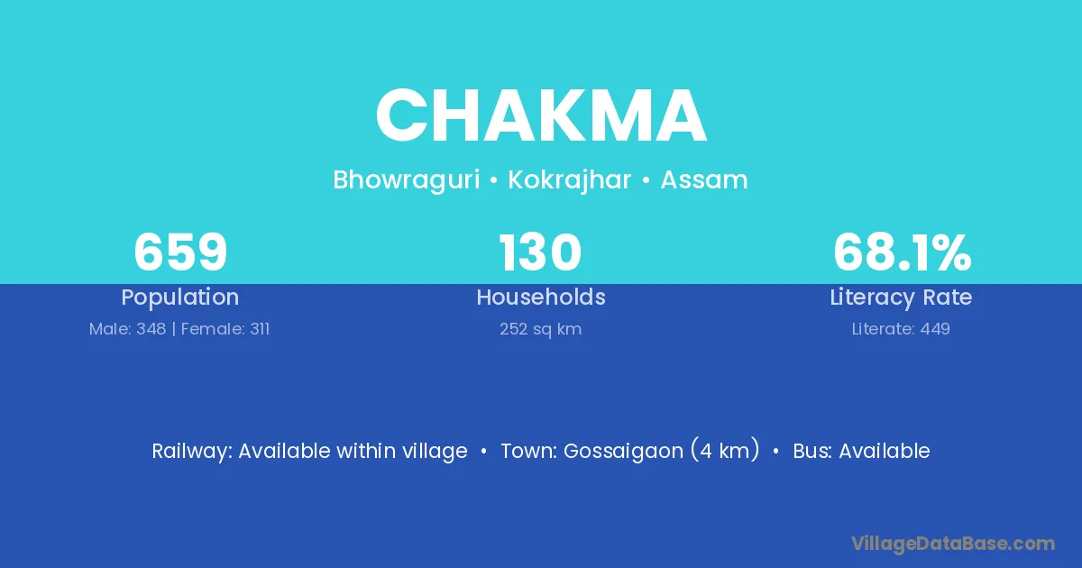 Gossaigaon (4 km) is the nearest town to Chakma village for major economic activities and is located approximately 4 km away.