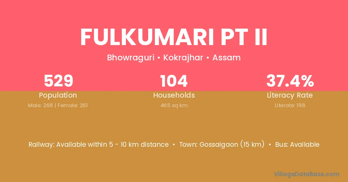 Gossaigaon (15 km) is the nearest town to Fulkumari Pt Ii village for major economic activities and is located approximately 15 km away.