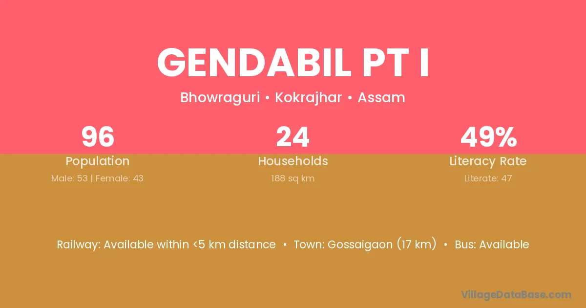 Gossaigaon (17 km) is the nearest town to Gendabil Pt I village for major economic activities and is located approximately 17 km away.