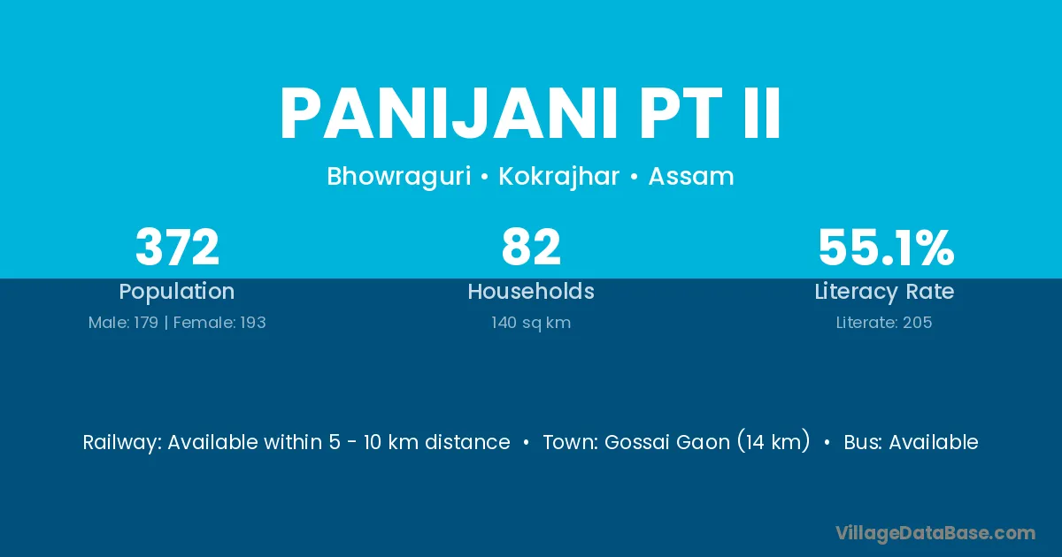 Gossai Gaon (14 km) is the nearest town to Panijani Pt Ii village for major economic activities and is located approximately 14 km away.