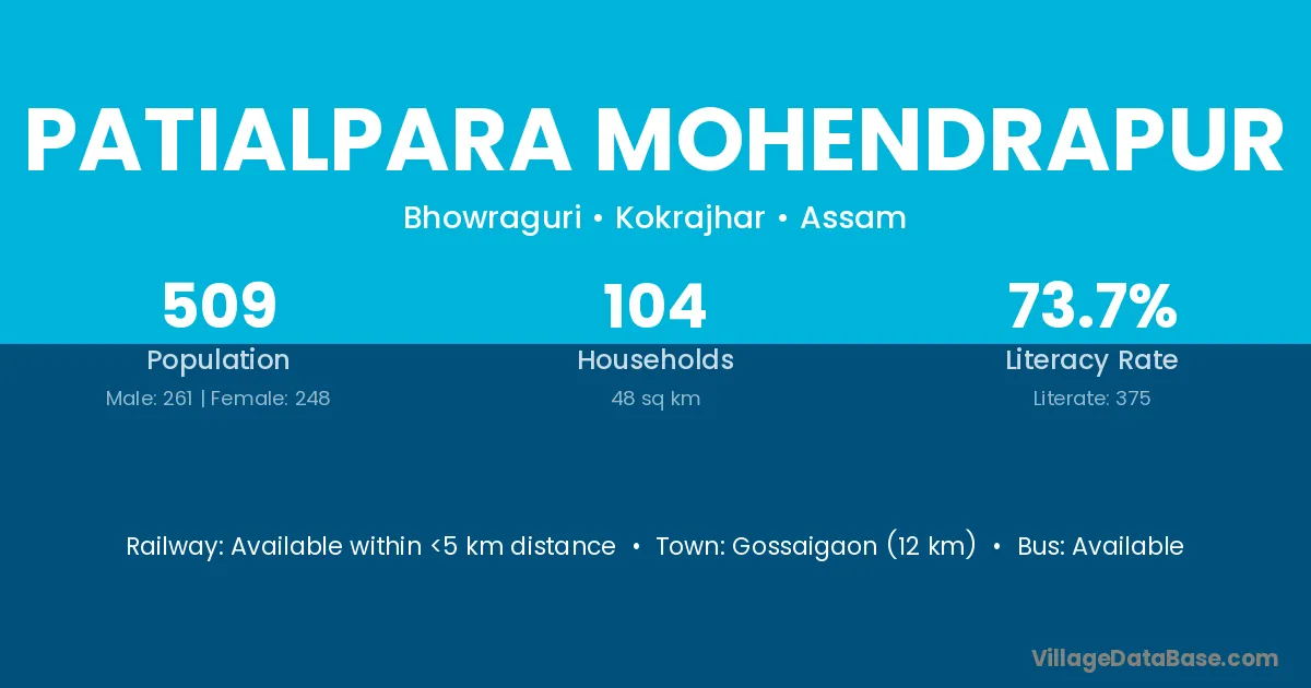 Gossaigaon (12 km) is the nearest town to Patialpara Mohendrapur village for major economic activities and is located approximately 12 km away.