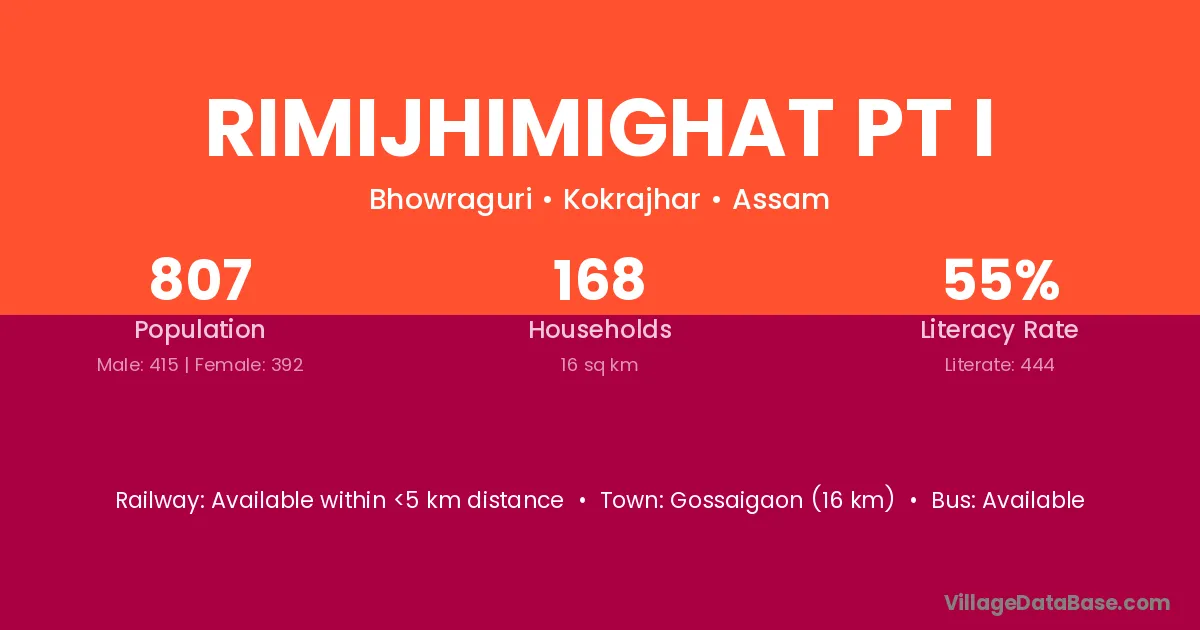 Rimijhimighat Pt I village has a total population of 807 people, of which 415 are males and 392 are females.