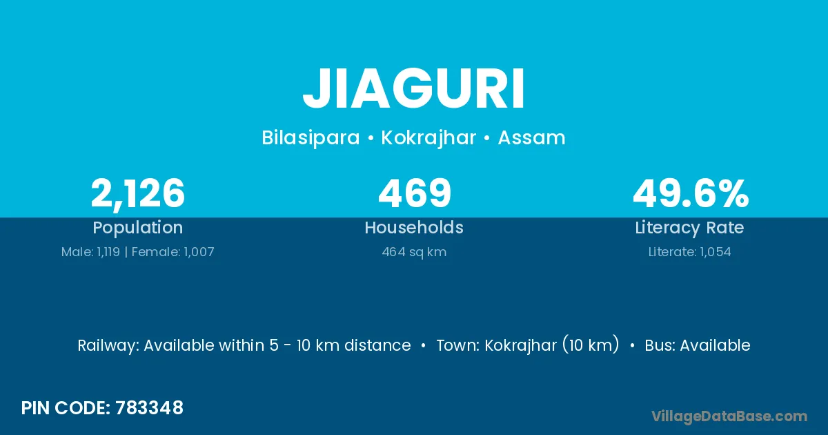 Kokrajhar (10 km) is the nearest town to Jiaguri village for major economic activities and is located approximately 10 km away.