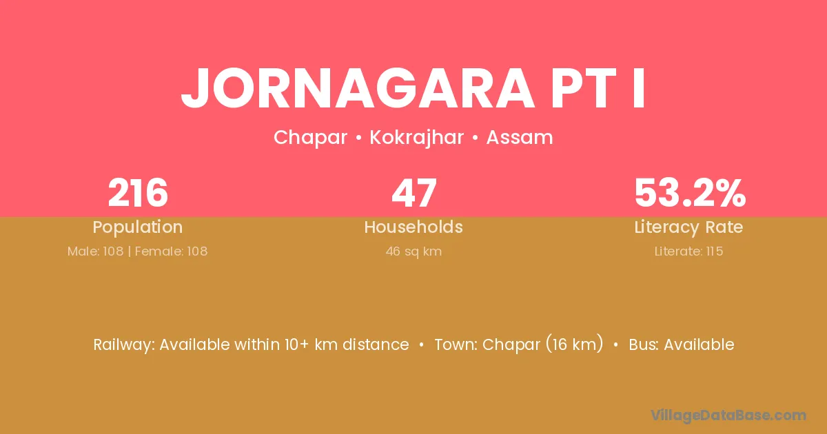 Chapar (16 km) is the nearest town to Jornagara Pt I village for major economic activities and is located approximately 16 km away.