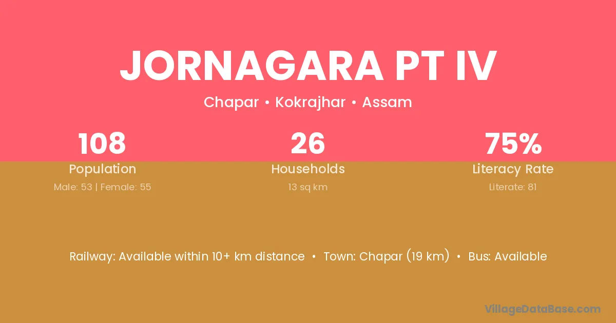Chapar (19 km) is the nearest town to Jornagara Pt Iv village for major economic activities and is located approximately 19 km away.