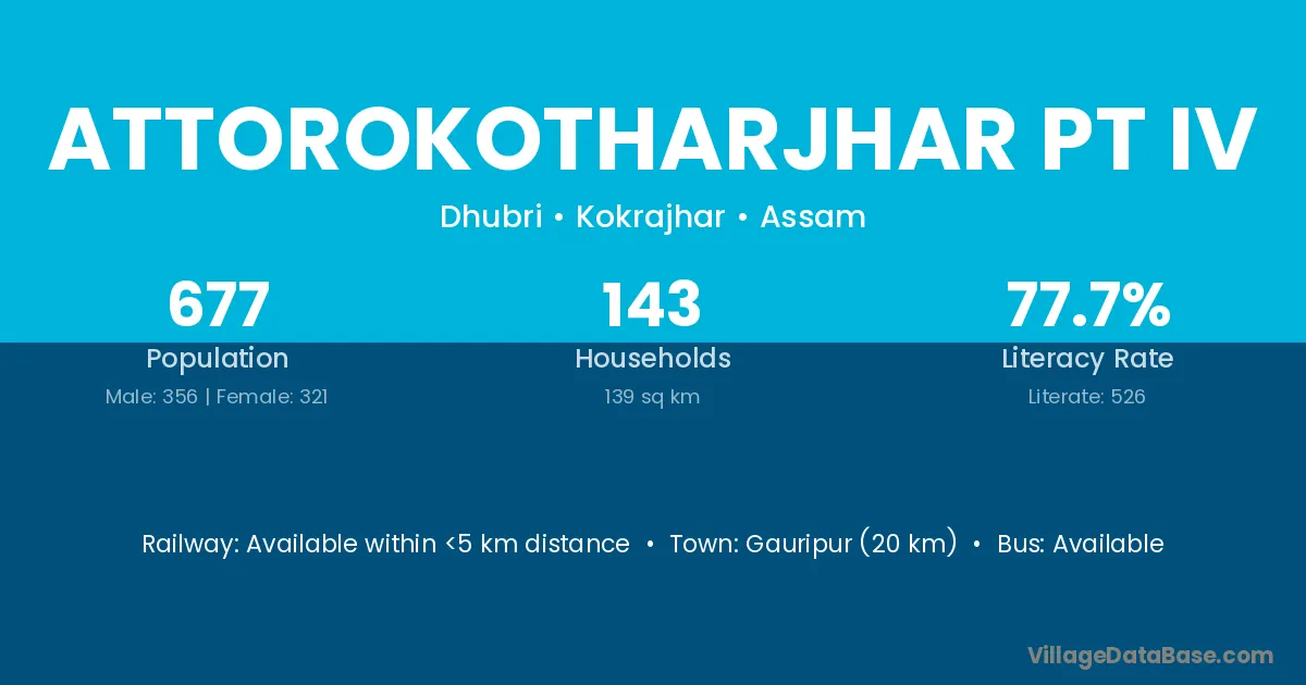 Attorokotharjhar Pt Iv village has a total population of 677 people, of which 356 are males and 321 are females.