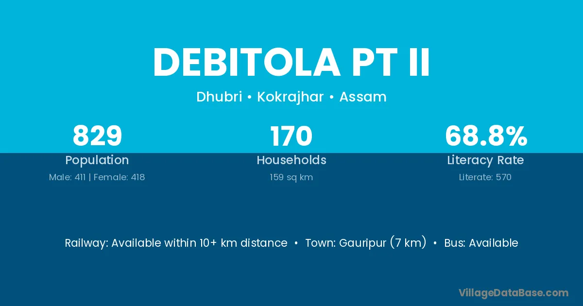 Debitola Pt Ii village has a total population of 829 people, of which 411 are males and 418 are females.