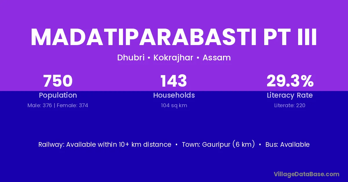 Madatiparabasti Pt Iii village has a total population of 750 people, of which 376 are males and 374 are females.