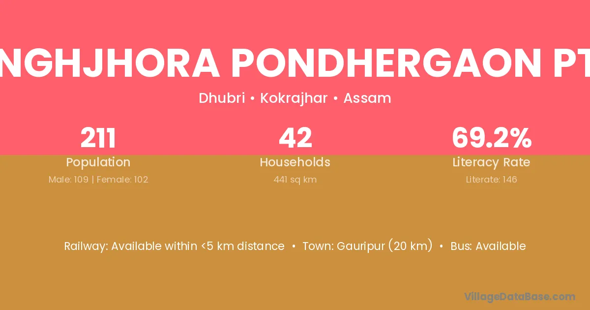 Gauripur (20 km) is the nearest town to Singhjhora Pondhergaon Pt Ii village for major economic activities and is located approximately 20 km away.