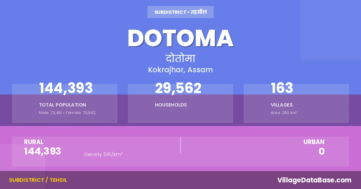 According to the 2011 census The total area of Dotoma Subdivision is 280 km², with a population of 144393 people. The population density is 515 inhabitants per square kilometre, and there are approximately 29562 houses in the sub district.