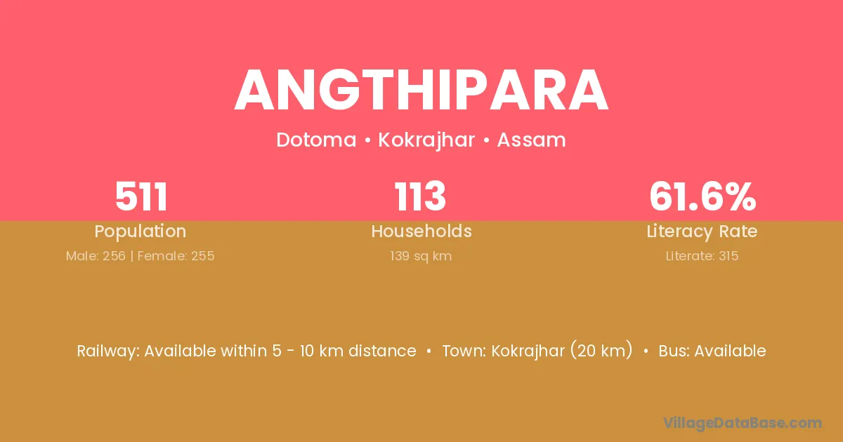 Angthipara village has a total population of 511 people, of which 256 are males and 255 are females.