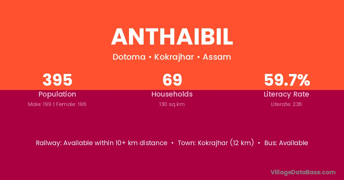 Kokrajhar (12 km) is the nearest town to Anthaibil village for major economic activities and is located approximately 12 km away.