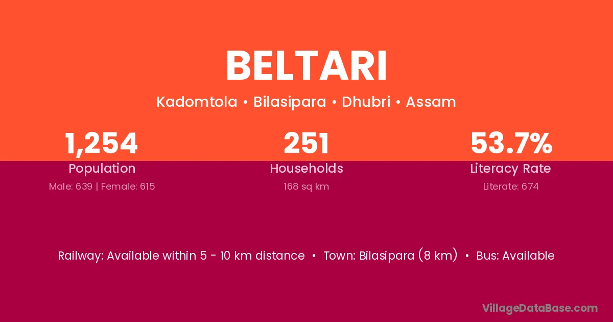 Kokrajhar (10 km) is the nearest town to Beltari village for major economic activities and is located approximately 10 km away.
