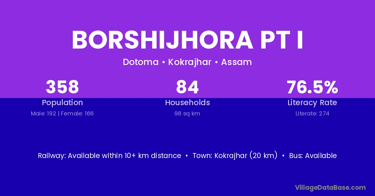 Kokrajhar (20 km) is the nearest town to Borshijhora Pt I village for major economic activities and is located approximately 20 km away.