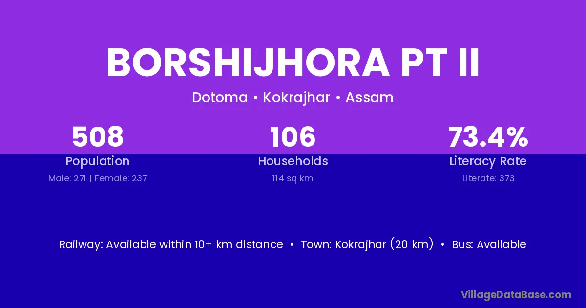 Kokrajhar (20 km) is the nearest town to Borshijhora Pt Ii village for major economic activities and is located approximately 20 km away.