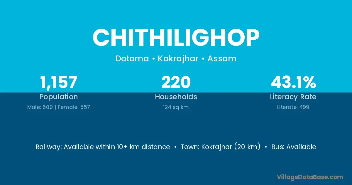 Kokrajhar (20 km) is the nearest town to Chithilighop village for major economic activities and is located approximately 20 km away.
