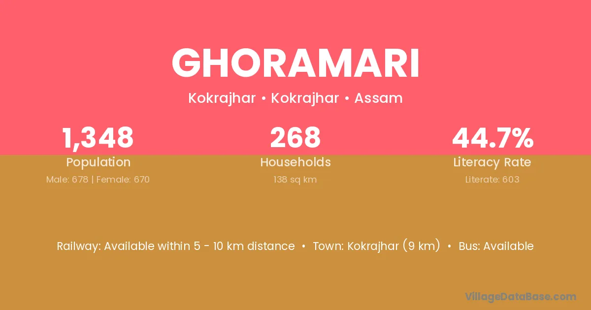 Kokrajhar (13 km) is the nearest town to Ghoramari village for major economic activities and is located approximately 13 km away.