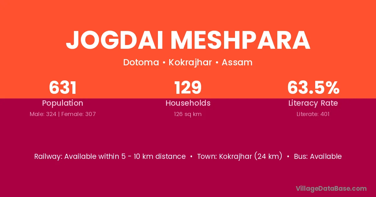 Kokrajhar (24 km) is the nearest town to Jogdai Meshpara village for major economic activities and is located approximately 24 km away.