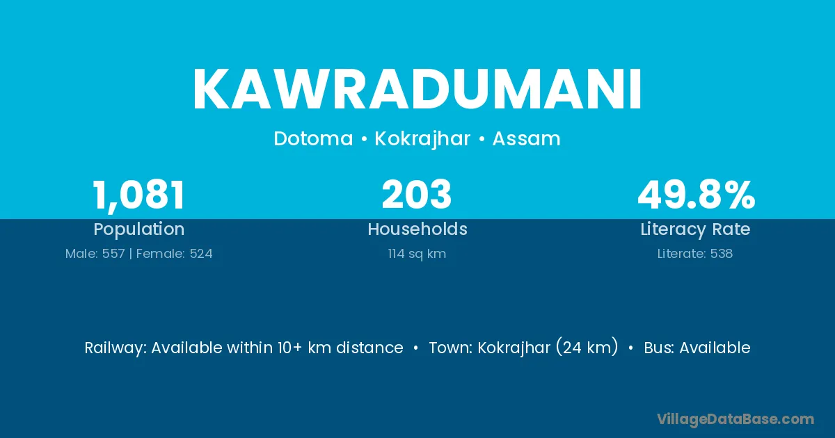 Kokrajhar (24 km) is the nearest town to Kawradumani village for major economic activities and is located approximately 24 km away.