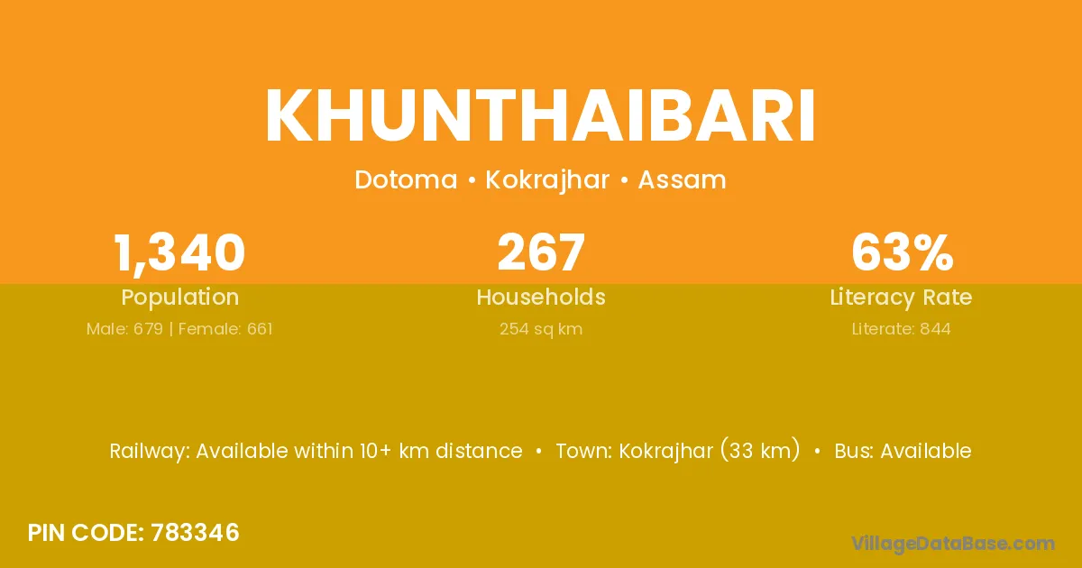 Kokrajhar (33 km) is the nearest town to Khunthaibari village for major economic activities and is located approximately 33 km away.