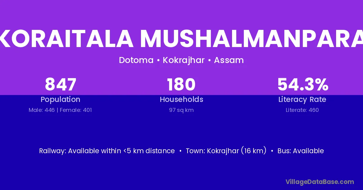 Kokrajhar (16 km) is the nearest town to Koraitala Mushalmanpara village for major economic activities and is located approximately 16 km away.