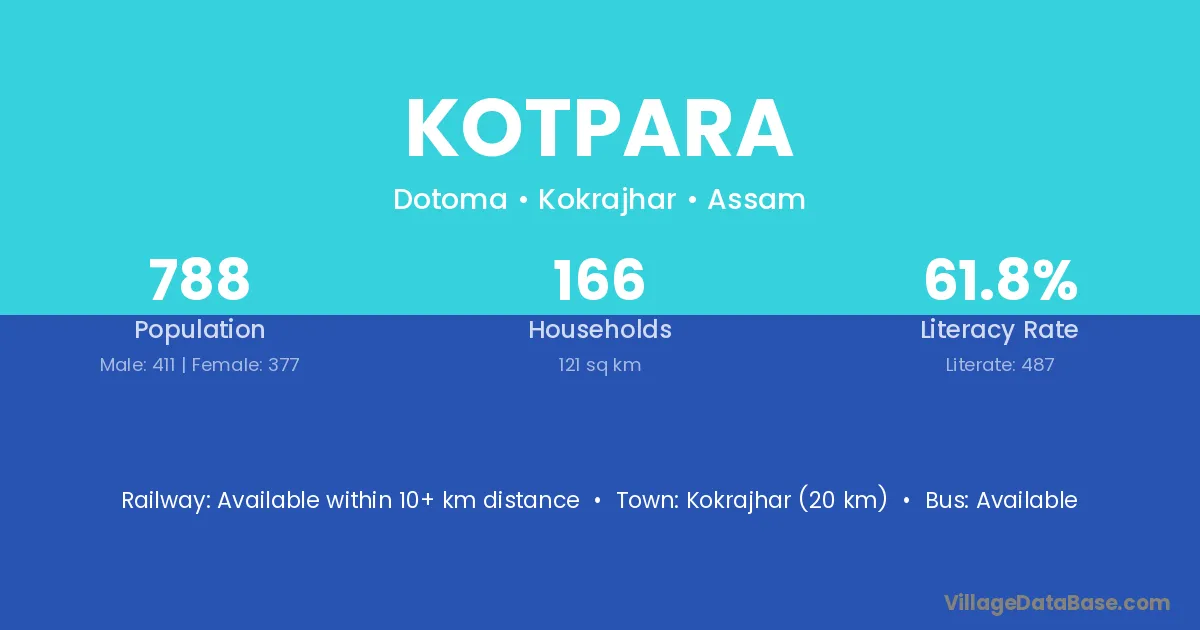 Kokrajhar (20 km) is the nearest town to Kotpara village for major economic activities and is located approximately 20 km away.