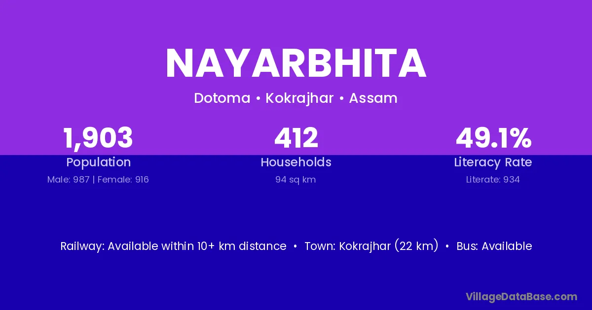 Kokrajhar (22 km) is the nearest town to Nayarbhita village for major economic activities and is located approximately 22 km away.