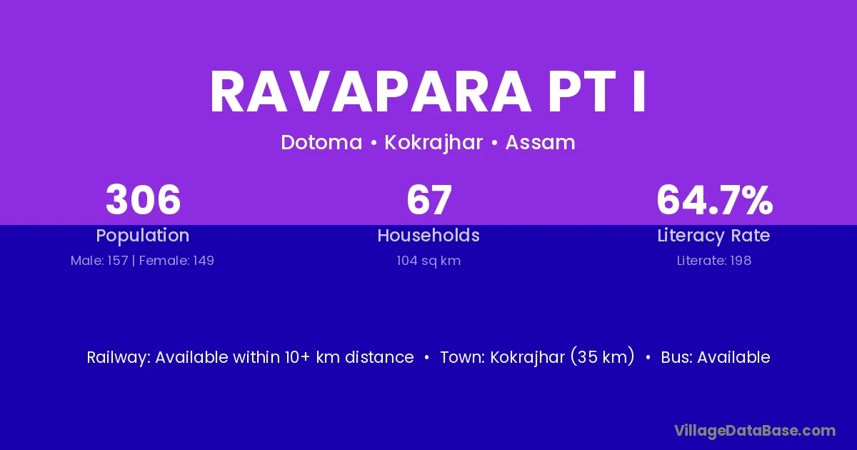 Kokrajhar (35 km) is the nearest town to Ravapara Pt I village for major economic activities and is located approximately 35 km away.