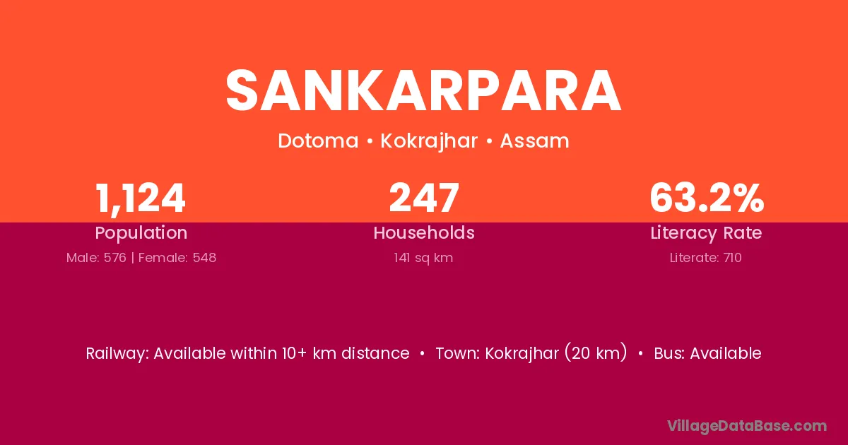 Kokrajhar (20 km) is the nearest town to Sankarpara village for major economic activities and is located approximately 20 km away.
