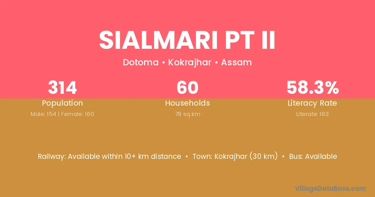 Kokrajhar (30 km) is the nearest town to Sialmari Pt Ii village for major economic activities and is located approximately 30 km away.