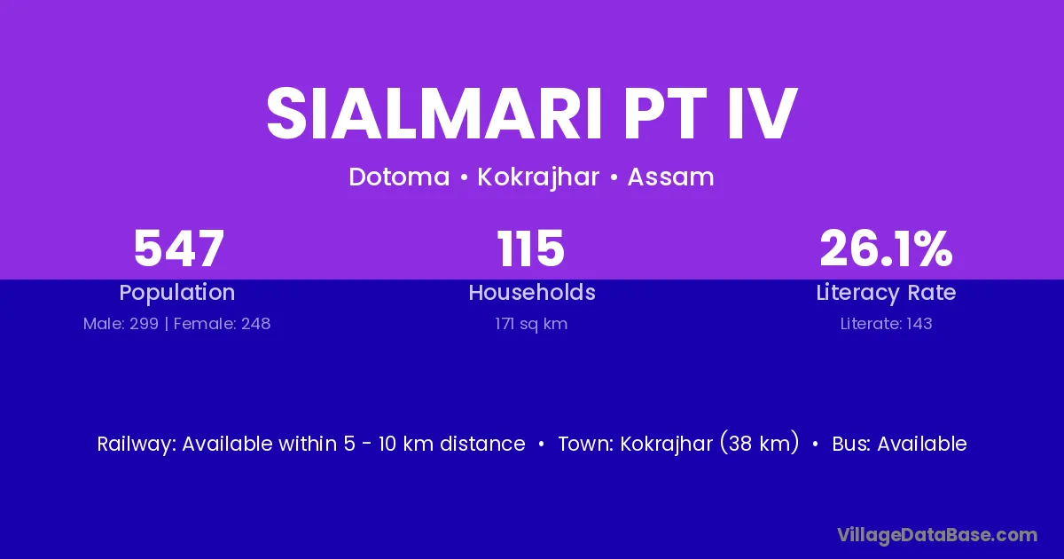 Kokrajhar (38 km) is the nearest town to Sialmari Pt Iv village for major economic activities and is located approximately 38 km away.