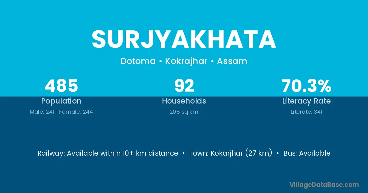 Kokarjhar (27 km) is the nearest town to Surjyakhata village for major economic activities and is located approximately 27 km away.